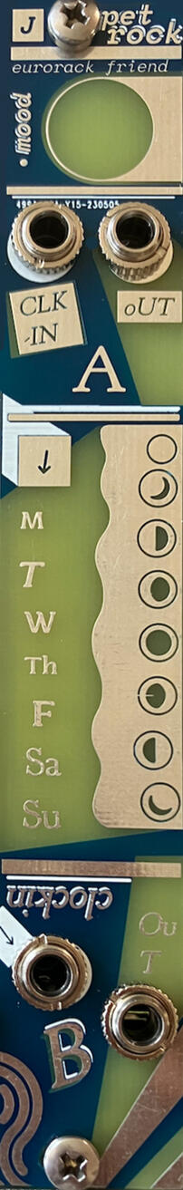 This 4hp Eurorack module generates a new rhythm every night at midnight that you have 24 hours to use. Pet Rock is like rhythm Wordle - everyone who owns the module gets the exact same rhythm. No internet connected needed.Pet Rock has 2 independently clockable (gate in, gate out) 'A' and 'B' rhythms each day, so there's flexibility in how you use it/clock it. The ‘A’ and ‘B’ rhythms can be used together as one composite rhythm, split into two separate rhythms, etc.Rhythm generation parameters change according to the real current moon phase. The overall "Mood" changes with every 30 day moon cycle to help keep things fresh. With each “Mood” change, Pet Rock switches between several custom algorithms to produce distinct styles.